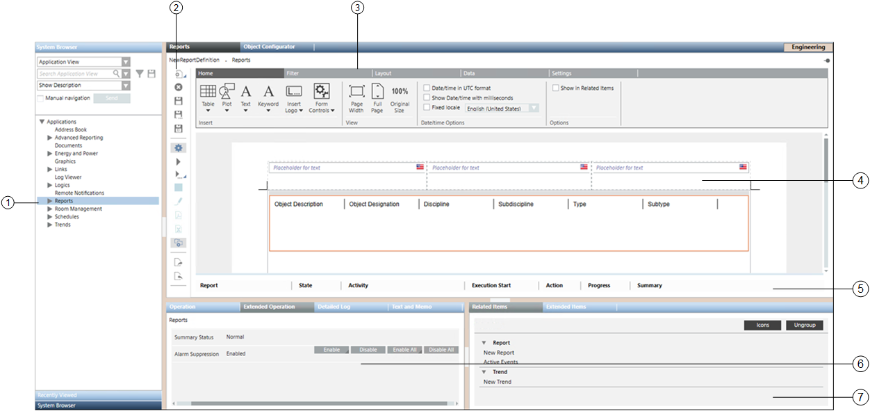 7 | Related Items Tab | Displays the following: New Report: Opens a new Report Definition for configuration. Related Report: Displays the names of the reports related to the selected System Browser object. Show-in-Related Items Report: Displays the name of the reports that has the Show In Related Items check box selected. |