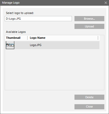 Close | Closes the Manage Logo dialog box. |