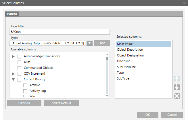Load | (Displays only for an Objects table) Click this button to populate the Available columns list with the columns corresponding to the selected object type in the Type list. |
