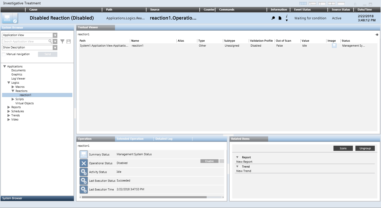 - The Investigative Treatment window opens. This is a window like System Manager, with the event descriptor along the top, and the object that caused the event already selected in System Browser. In Event List, the event button for that event is replaced by a blank placeholder to indicate it is under investigative treatment.