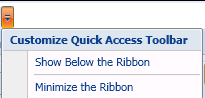 The Quick Access Toolbar menu allows you to move the mouse over the ribbon command buttons to add a task to the quick access toolbar or to mouse-over command buttons on the quick access toolbar to remove tasks. Depending on your settings, the quick access toolbar is located above or below the ribbon.