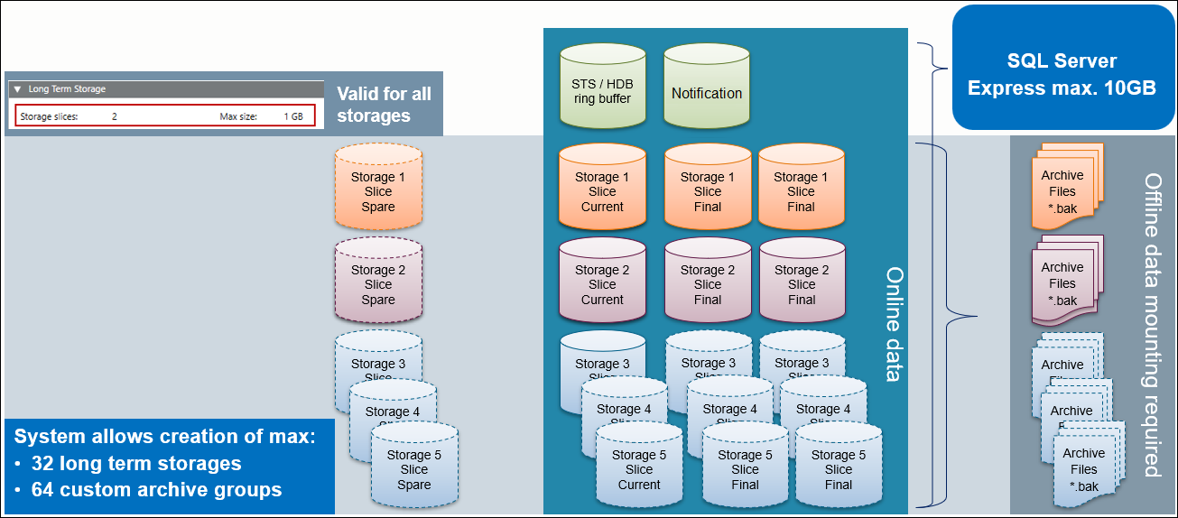 A project can have several archive groups. You can define settings for each archive group separately, whether the data is written to the Short Term Storage (STS) or the Long Term Storage (LTS) (see Configuring History Database in System Browser). Each LTS can have one or more LTS slices. You cannot edit or delete data in the LTS. You can only add data.