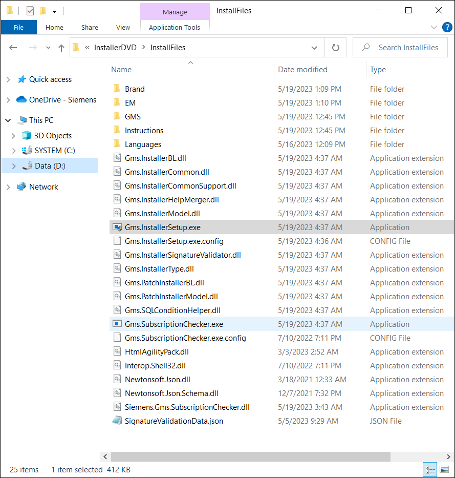 - GMS Folder: Verify that the mandatory en-US language pack, the prerequisites, such as WinCC OA 3.19, EULA and README files, GMSConfig.xml file, Siemens.GmsPlatform.msi, ProjTemplates are available.