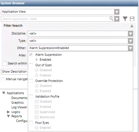 - In System Browser, select the system object for which you want to disable alarm suppression.