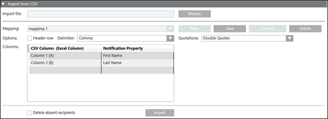 - Import: Starts the recipient user import from the selected CSV file based on the configured mapping.