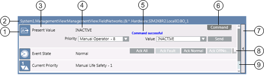 6 | Command area | Displays the name of a command that you can initiate. If a command button has a triangle in the lower right-hand corner, the command has multiple buttons or options, and clicking on the triangle displays the options. Some commands are sent immediately after you initiate them by clicking on the Command button. Others require you to enter arguments before they can be sent. When a command requires arguments (additional fields requiring information to continue with the command), the property row will expand after you click the command button. You then complete the additional fields and click the appropriate button (Send, Command, etc.). Some object properties support grouping of command buttons under a single command button with a drop-down list of your choices. The button you choose from the drop-down list becomes the new commandable button in the group. The Send button displays only for commands that require additional arguments. Clicking the Send button sends a command after you have entered all required arguments. Command Types: Multiple Option Selection: