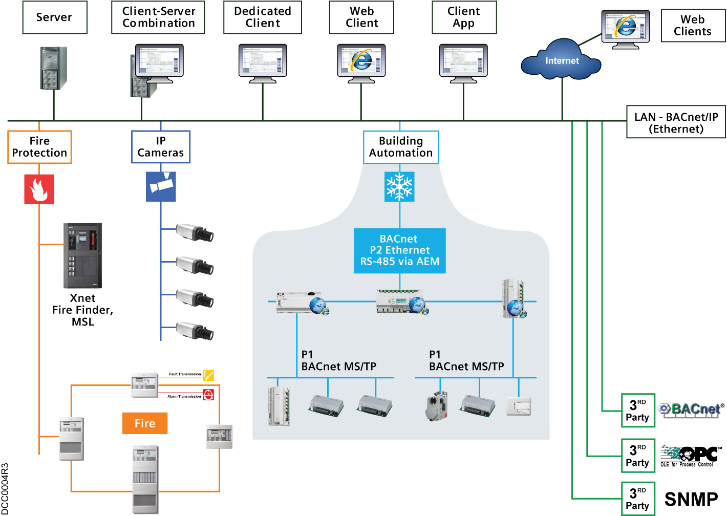 The following diagram highlights an APOGEE BACnet and an APOGEE P2 network, along with other networks for fire (UL 864/ULC S527-compliant) and video in a Total Building Solution (TBS) architecture.