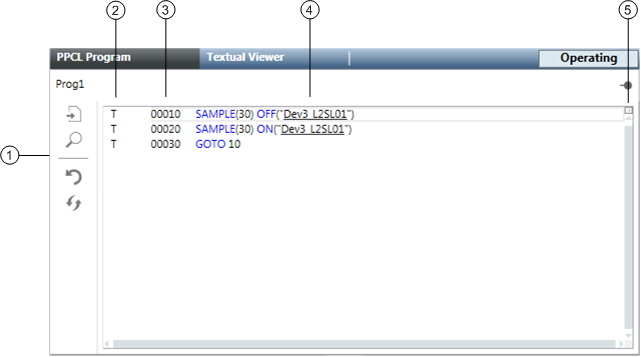 1 | PPCL Viewer Toolbar Includes the following controls: Go To Program Statement: Allows you to go to the specified line of code in the program. Search Text: Allows you to search text.. Clear Program Trace Bits: Clears trace bits and unresolved lines of code in the program. Trace bits appear in the Status column as a T. Unresolved lines of code appear in the Status column as a red U. Refresh Program: Connects to the field panel and reads program statements and their status. In other words, after clicking Refresh, the data in the field panel and the data displayed in the PPCL Viewer are synchronized. |