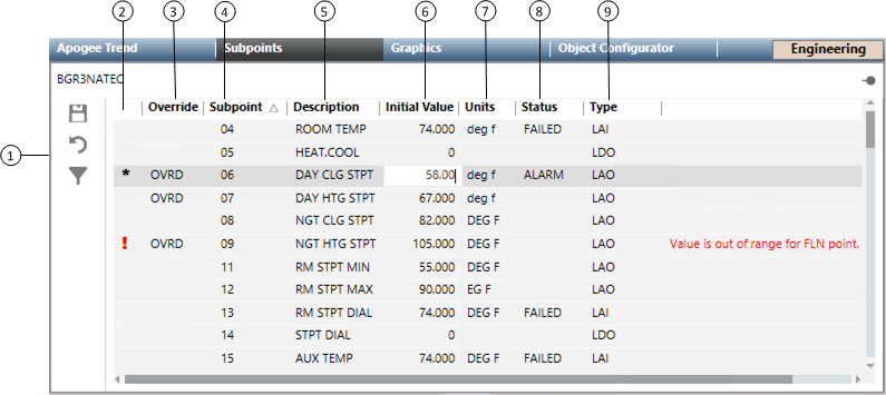 4 | Subpoint NOTE: Column displays only when an APOGEE P2 TEC application is selected in System Browser. Does not display when BACnet TEC applications is selected. |