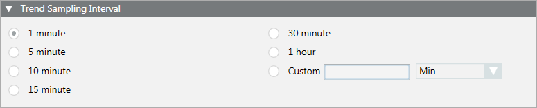 Defines the time interval for collecting samples. You can select one of the default sampling intervals or you can enter a custom sampling interval. The shortest interval is one minute. You are prevented from selecting an interval that is already defined for this point in another trend definition. | |