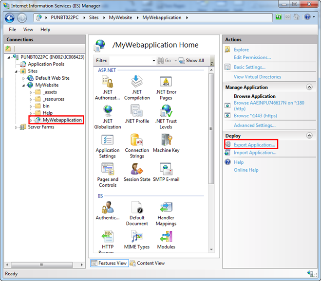 - A web application is created using the SMC under a parent website with the host name of the Target machine where you want to export the web application.