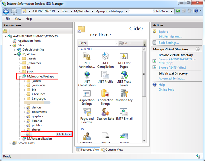 - The ClickOnce virtual directory is added under the web application node in IIS.