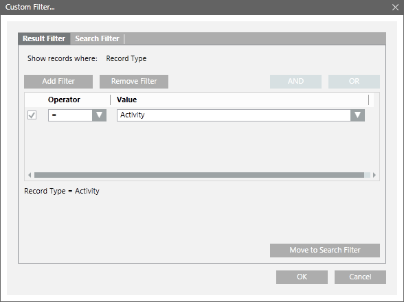 Move to Search Filter | Displays only when the Result Filter tab is selected. Allows you to move the result filter to a search filter. |