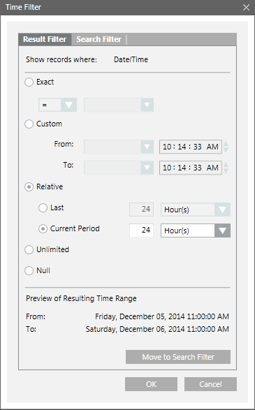 Preview of Resulting Time range | Displays the resulting time range for the options selected in the Time Filter dialog box. For example, if the present time is 08/07/2014 10.35 AM, then for the current 1 hour selection, the Preview of Resulting Time