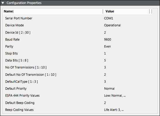 - In the Configuration Properties expander, enter values as stated below (For more information refer ESPA Paging System section in Notification Supported HW/SW Device Configurations Guide):