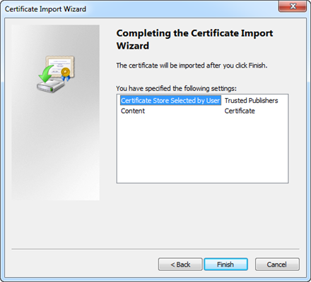 You want to install the certificates in the Trusted Publisher Windows Certificate store using the Certificate dialog box.