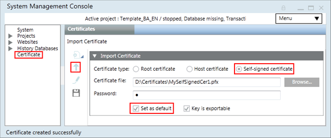 - A host certificate (.pfx and .cer files) for the server using the server root certificate is created at the configured path.
