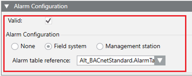 TableReference | Mandatory | Name of the event table. NOTE 1: In case of empty string (“TableReference”: “”), the default value is assumed. NOTE 2: The name specified here must correspond to the name of a data point of type “GmsAlarmTable_Driver” already present in the project. If the specified name does not correspond to a data point in the project, the default (empty string: “”) value is assumed. NOTE 3: The name specified here can or cannot have the suffix “.AlarmTable”. In the last case, the suffix will be automatically added. |