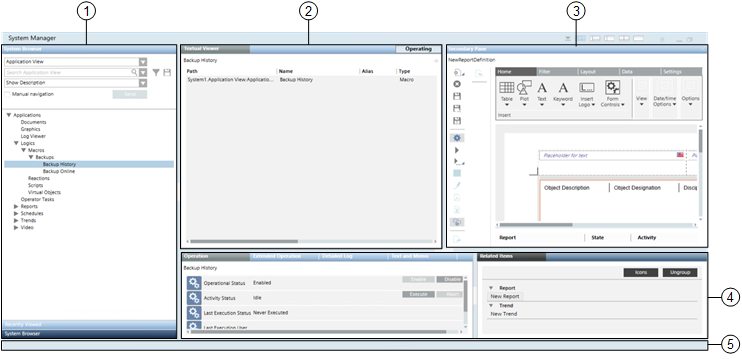 The system screen can display many windows, some of which are made up of multiple panes, divided by splitters. A window can contain up to four panes. Each pane houses a functional component of Desigo CC (such as a browser for navigating and selecting system objects, a viewer for displaying site floor plans or tools for inspecting the properties of objects).
