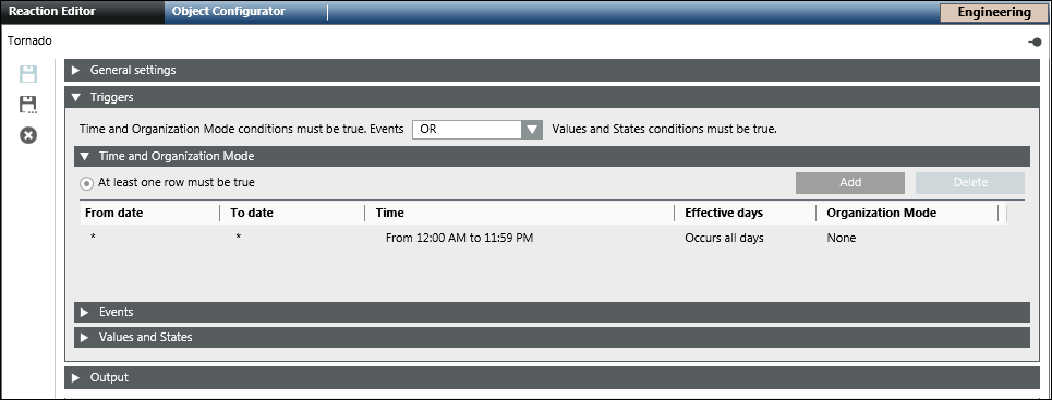 - In the Triggers expander, specify if the conditions specified in both, the Events as well as Values and States, expanders must be true or if the conditions specified in either of the expanders must be true by selecting the appropriate operator (AND, OR) in the drop-down list.