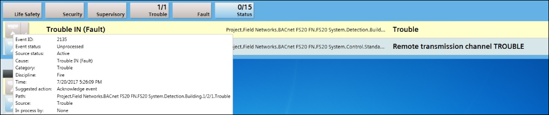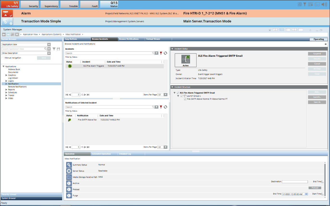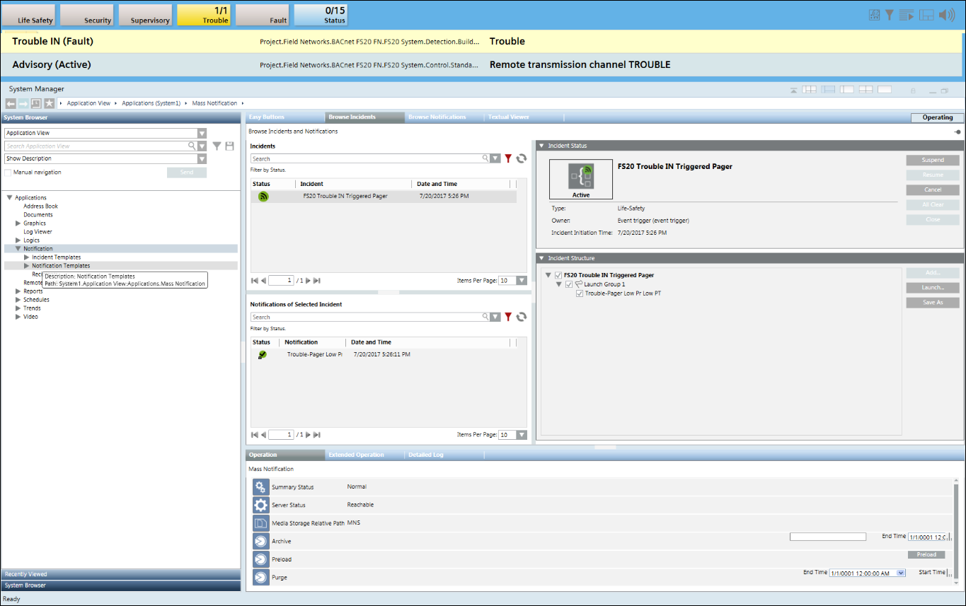 - When an event from the BACnet or Xnet interface is generated, the incident you created in step 4 (Incident_BACnet or Incident_Xnet) is initiated and can be verified from the Browse Incidents tab by selecting Applications > Notification > Browse Incidents.