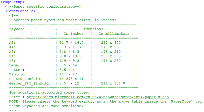 - Within the <PaperType> tag, enter the exact paper type (Keyword) as in the Paper Details section. For example, <PaperType>A4</PaperType>.