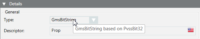 - In the Details expander and in the General group box, check the Type. The data type GmsBitString based on PvssBit32 must display in the tool tip.