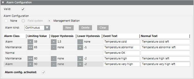 You can easily create an advanced temperature monitor by selecting the temperature sensor (Present_Value) in System Browser. Define a corresponding message for each temperature limit. The corresponding message is sent out when the set values are reached. Use the Hysteresis columns to avoid triggering additional messages for slight temperature deviations.
