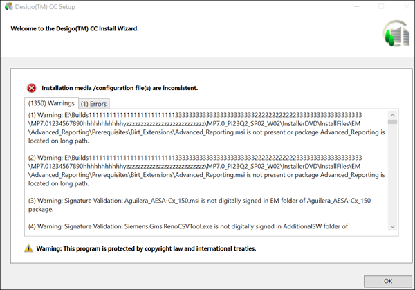 When digital signature validation is performed, the warning messages are significantly reduced because of Windows restriction for not reading files available on long path. The Windows is unable to find the installation media placed at long source or destination path.